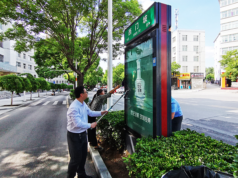 活動中,全體員工分組前往西門坡、文化街、石家巷、西大街等城區(qū)主干道,對道路指示牌進(jìn)行了認(rèn)真細(xì)致的清洗,鏟除清潔了粘貼的小廣告,對廣告設(shè)施內(nèi)部電子元件做了維護(hù)保養(yǎng),確保箱體無積塵、無亂涂畫、無亂張貼等現(xiàn)象,以實(shí)際行動為創(chuàng)建文明城市和公司發(fā)展貢獻(xiàn)力量。